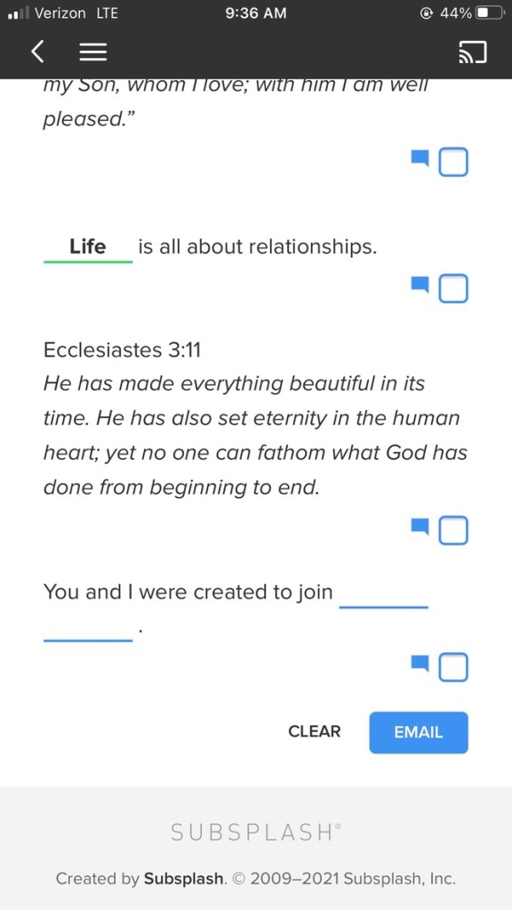 In the online notes, there were blanks for parishioners to fill in the blank spots by tapping the keyboard on their mobile devices. I used my iphone. From the screen shots I’ve included here, you can see in one of the blank spaces I wrote in the word “life,” which in the screenshot has a green line beneath the word life. The blank lines were blue before anything was typed on them. The blue line turned green after I typed “life,” indicating my answer was right. I waited to type the word life until after the preacher said it.